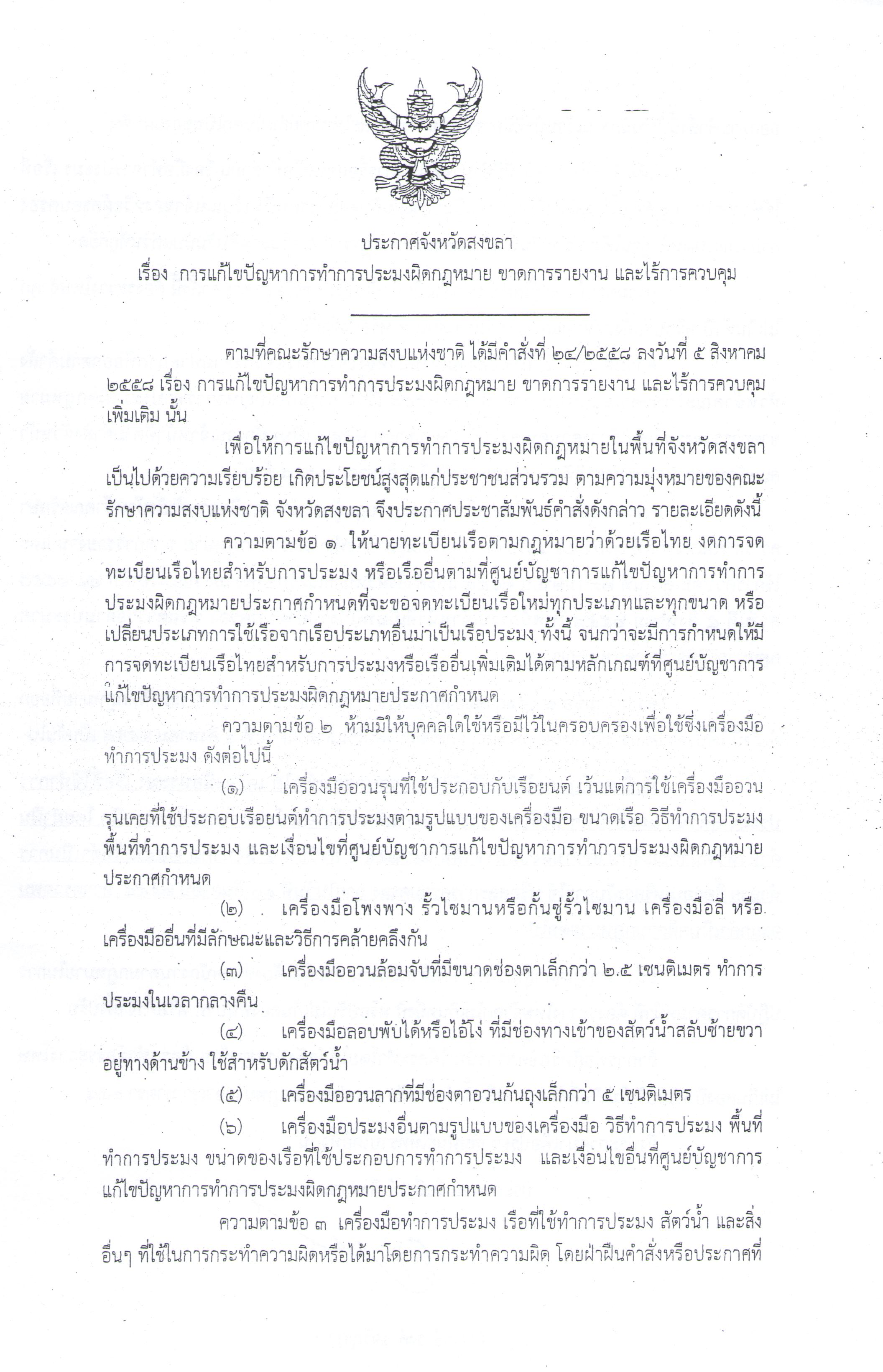 ประกาศจังหวัดสงขลา เรื่อง การแก้ไขปัญหาการทำประมงผิดกฎหมาย ขาดการรายงานและไร้การควบคุม