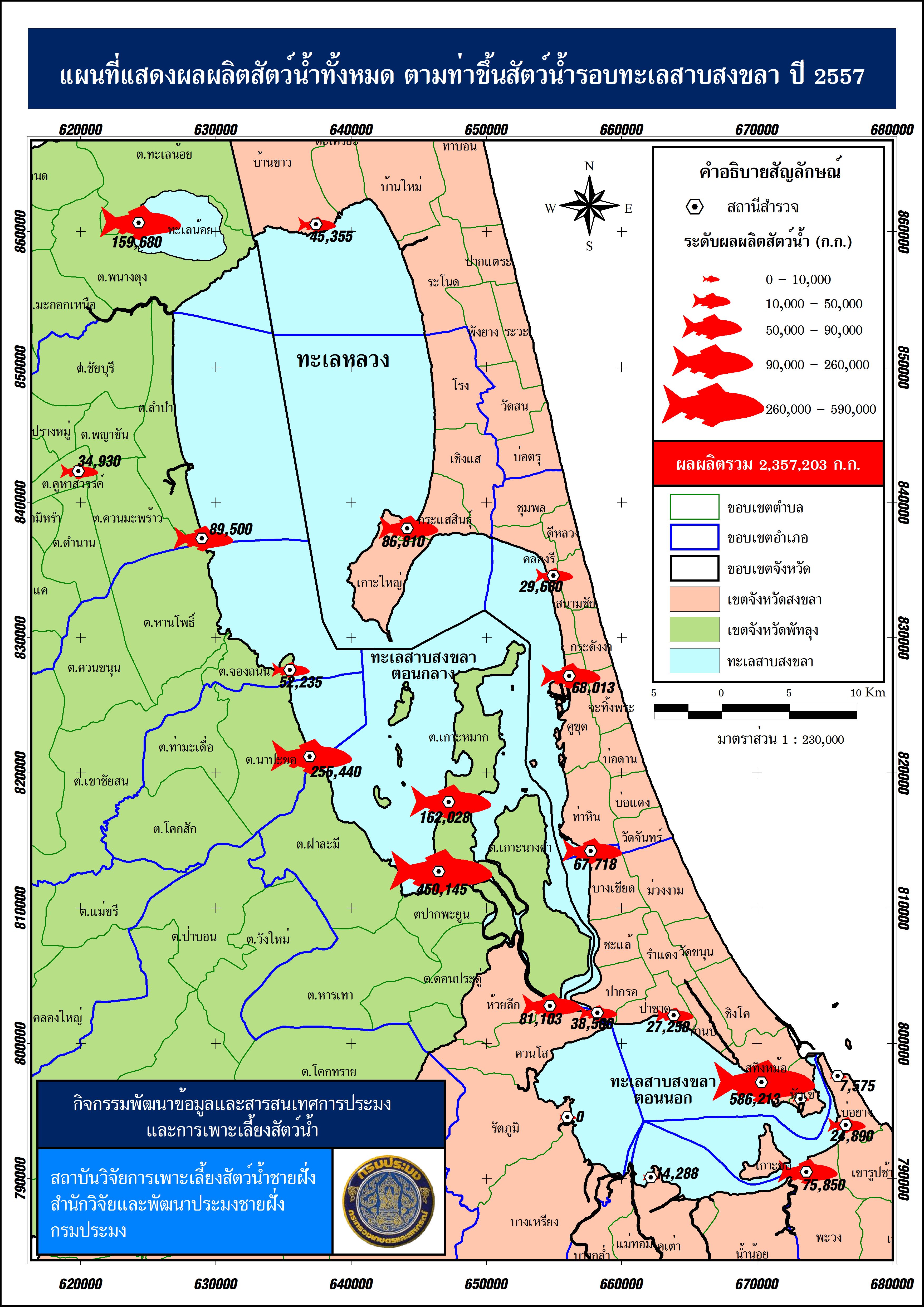 แผนที่แสดงผลผลิตสัตว์น้ำรวมจากท่าขึ้นสัตว์น้ำรอบทะเลสาบสงขลาปี พ.ศ. 2549-2557